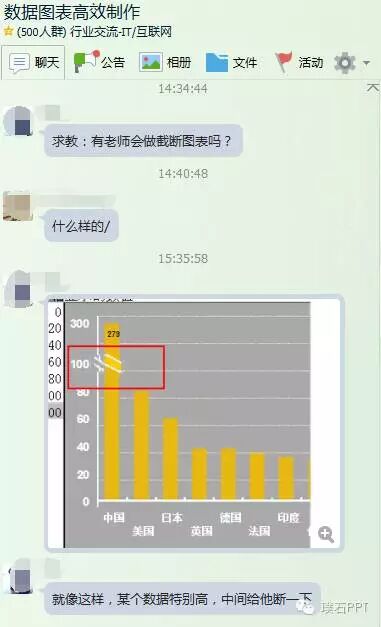 這是非常常用的一種方法,也是最簡單,最好理解的,手動修改最大值的數值,使它稍高於次最高值,並用PPT中自帶的繪圖工具繪製截斷標識,放到合適的位置即可。