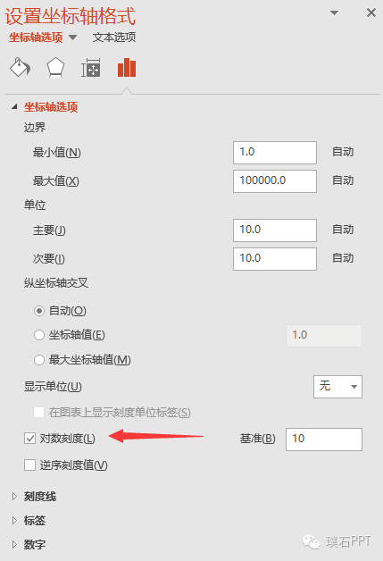 選中數值坐標軸,右鍵設置坐標軸格式中選擇對數刻度。